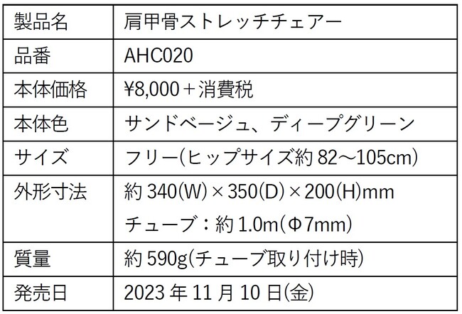 「肩甲骨ストレッチチェアー」は、姿勢をサポートしながら、手軽に肩甲骨のストレッチができる新発想のチェアーです。初年度販売目標数量は6,000個です。