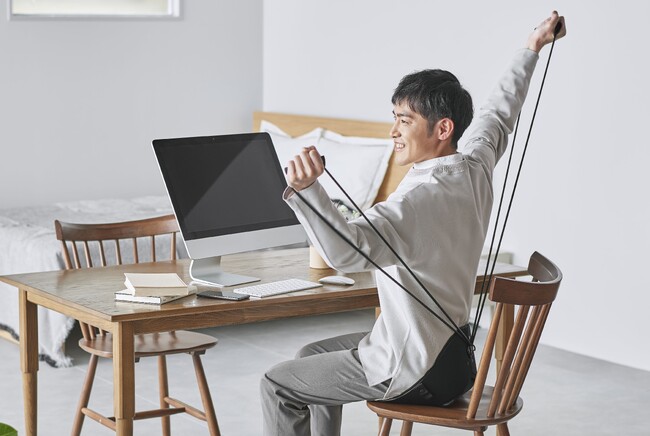「肩甲骨ストレッチチェアー」に座ると座面に体重がかかり、チェアーの背当て部分が前方にせり出すことでよい姿勢に導きます。付属のゴムチューブで、手軽に肩甲骨ストレッチができ、デスクワークで凝り固まった肩をほぐせます。チューブは本体側面のスナップボタンで収納できます。
