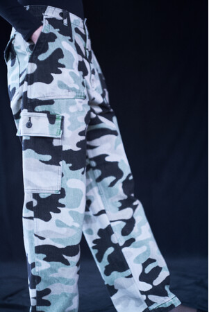カモフラージュ柄は型友禅を用いて、パーツごとにデニムの色を段落ち抜染しながら部分的に顔料で色を乗せて表現したもの。抜染と顔料抜染を同時に行う繊細な表現は京友禅ならではの職人技です。