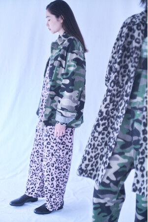 12.5オンスのブラックデニムに型友禅の段落ち抜染や顔料抜染、顔料染めという技法で、カモフラージュとレオパードの2つの柄を表現。