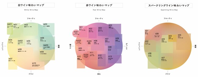 wine@では、ワインの複雑な味わいを分かりやすく表現するために、「ワイン味わいマップ」を開発。全世界のワインを白13タイプ、赤13タイプ、ロゼ4タイプ、スパークリング8タイプに分類して、色分け、可視化しました。ワインに詳しくないユーザーでも自分のワインの好みを簡単に表現できるようになっています。