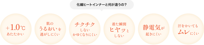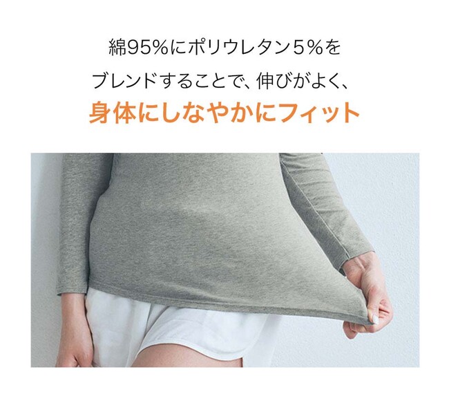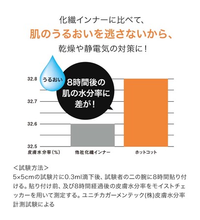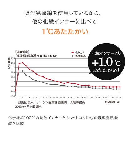 また、あったかインナーの素材について、化繊の方が綿素材よりもあたたかい印象をお持ちの方も多いと思いますが、実は綿95%のホットコットは、化繊吸湿発熱インナーより+1.0℃あたたかいという結果が出ています。さらに、化繊負け(化学繊維が含まれている衣服を着て起こる肌トラブル)という言葉がありますが、ホットコットは天然素材を使用しているから肌に優しく、刺激の原因と言われている「肌の乾燥(皮膚水分の低下)」、「静電気の刺激」にも優位性があることからかゆくなりにくいので、敏感な方におすすめです。