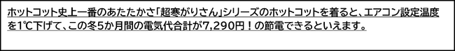 ホットコットの中で最も保温性の高い「超寒がりさん」シリーズを着ることでどれくらいの節電効果があるのか調べてみたところ、エアコン設定温度を1℃下げることできて、この冬5か月間の電気代合計「7,290円」!の節電効果を得られるというデータ(※参照)が得られました。