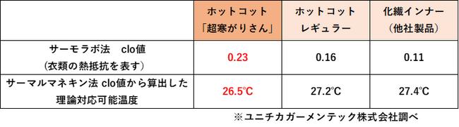 ⇒「超寒がりさん」ホットコットは他社製品(化繊吸湿発熱インナー)より室温が0.9℃低くても同等のあたたかさを感じる