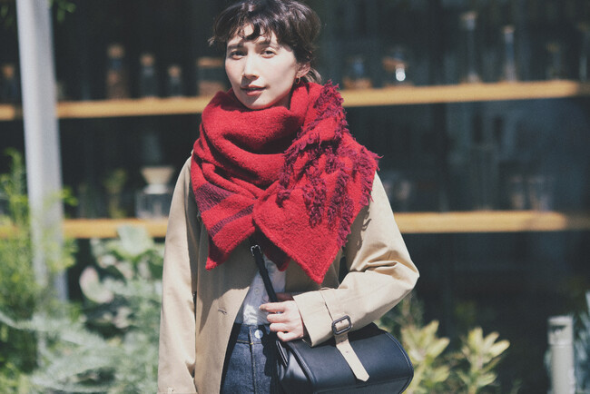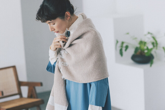 寒い冬をごきげんに過ごせるように、一枚でくるりと表情が変わるストールを作りました。ベビーアルパカとウール混の生地を使用しているので、軽くて暖かく、柔らかな巻き心地です。初のコラボストールのデザインは、図案から一緒に考えました。立体感のあるカットジャカードがポイントです。タイトに巻いても、ゆるりと羽織っても可愛く、おうちではさらりとブランケット代わりに巻くのもオススメです!