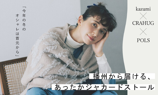 今回のコラボレーションは、『CRAHUG』が販売支援するファクトリーブランドの中からkazumiさんが『POLS』をセレクトし、国産高級先染め織物の生産地として知られる兵庫・播州で作られた“プードルフリンジ”という意匠性の高いデザインを用いたストールを開発しました。