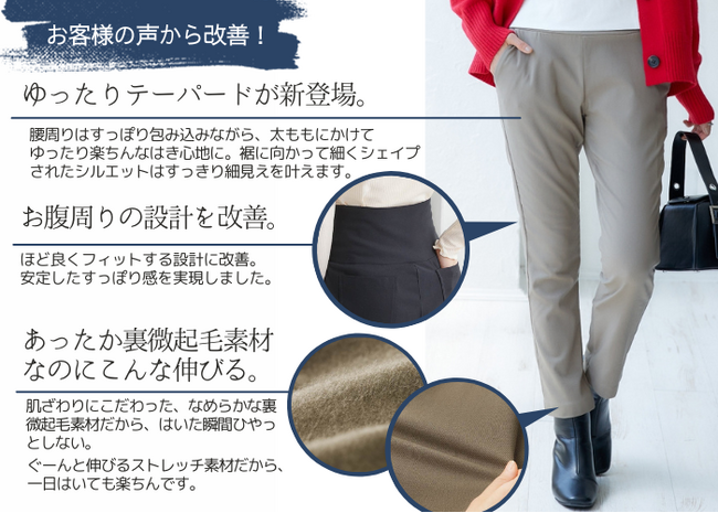 スキニーとテーパードの”いいとこどり”をしたこだわりのシルエットが好評な「ゆるフィットパンツ」シリーズの冬タイプが、進化して再登場!お客様の声を参考に、股ぐりから腰回りの設計を見直しすることで、しゃがんでも背中が出にくく安定した履き心地になりました。さらに、ウエストの伸縮率をアップすることでお腹への圧迫感を軽減し、やわらかな裏起毛素材は、昨年よりも起毛感をアップしました。まさに、肌触りも着心地も進化した、これからの季節に大活躍なパンツです。
