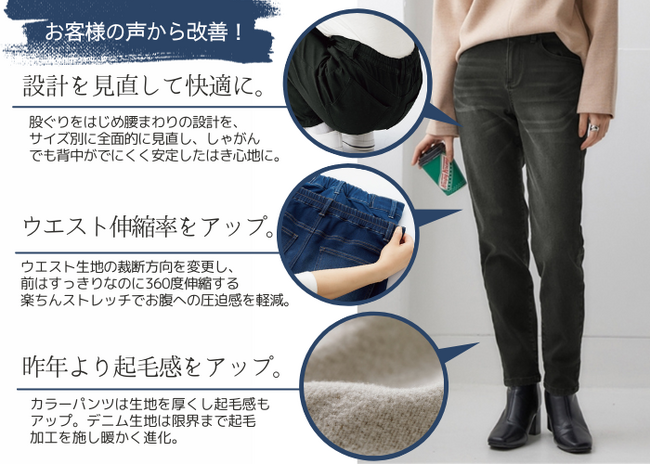 昨年好評だった「お腹すっぽり裏微起毛パンツ」シリーズのウエスト部分のフィット感を、寄せられたお客様の声から改善。より安定したすっぽり感のある”お腹周り設計”を実現しました。