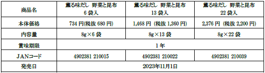 株式会社にんべん(東京都中央区、代表取締役社長 高津伊兵衛)は、「薫る味だし」の新フレーバーとして、日本橋だし場「薫る味だし 野菜と昆布」を11月1日(水)より新発売いたします。5種類の厳選野菜と北海道産真昆布を使用した動物性原料不使用のこだわりの味付きだしパックです。優しい味わいの野菜と昆布だしで、和洋様々なお料理をお楽しみください。