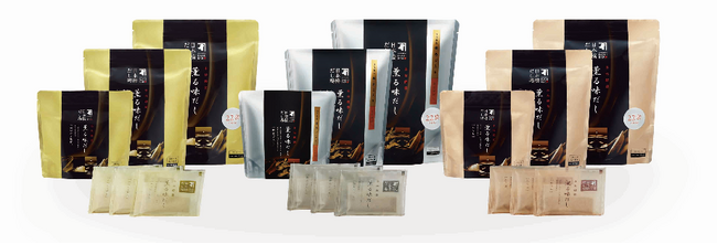 薫る味だしシリーズは「野菜と昆布」の他、「かつお」「かつおと昆布」「焼あご入り」の3種類の味をご用意しております。