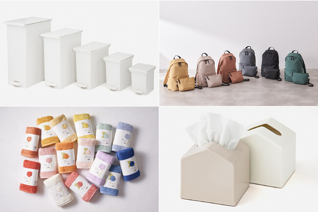 メディアで何度も取り上げられ、累計販売台数66万台を突破した「arrotsダストボックス」「KEYUCAダストボックスLL」、シリーズ累計販売数7万個以上を突破した機能性抜群「N撥水ライトシェルリュックM」、食卓の上はもちろん、洗面などの水回りでも安心して使え、累計販売数20万個以上売れている大ヒット中の「Moi コンパクトティッシュケース」、花の色をテーマにしギフトにもおすすめ「抗菌防臭Flowerフェイスタオル」など、便利で機能的な商品が目白押しです。