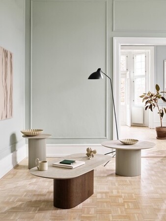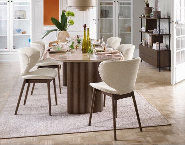 楕円形の天板は耐久性に優れたセラミック素材で作られており、ホワイト、ブラウン、アッシュグレーの3色から選ぶことができます。「セラミックの持つナチュラルな雰囲気は、このような大きな天板でこそ真価を発揮します」とディトリウ・ジェンセン氏は話します。光沢のある天板には、ダークオークとアッシュグレーから選択できる面取り加工を施した柱スタイルの脚を組み合わせています。「すっきりとしたラインとオーガニックなフォルムが、スタイリッシュな印象を与えます」とも。