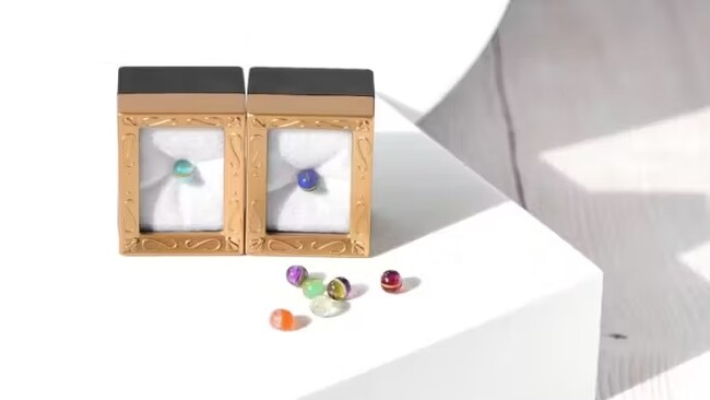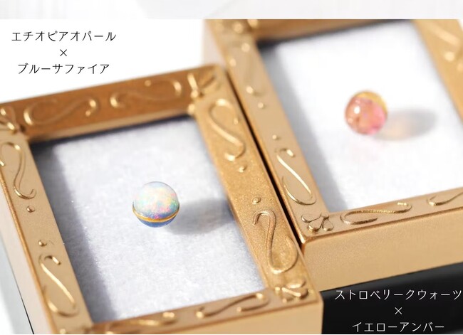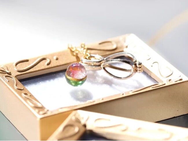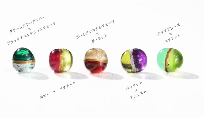 2色のカボッションの宝石を金継ぎで1個にして「美しいバイカラーの宝石・2色珠」にしました。1点1点、職人の手作りで作られています。