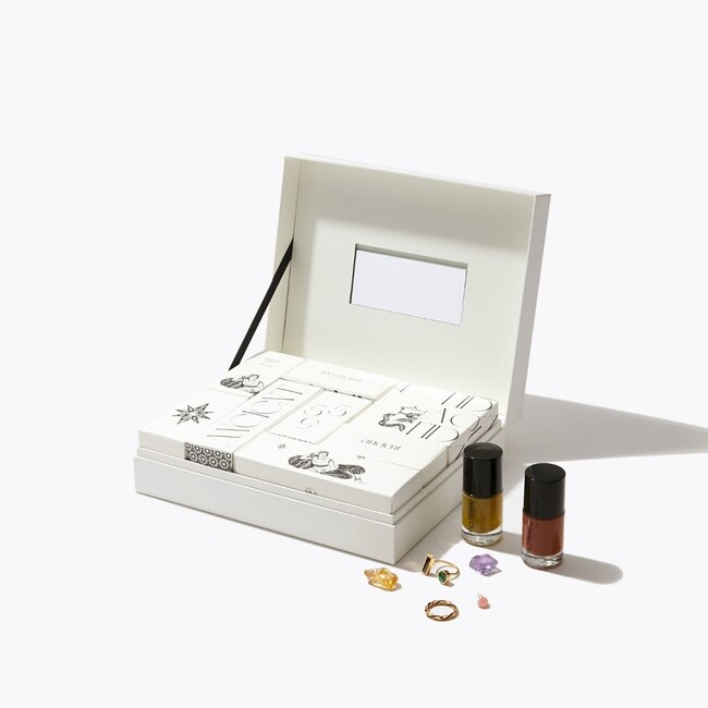サイズフリーのチェーンリング1点、アーカイブジュエリー2点(約36,000円以上)、ネイルポリッシュ2色、お守りの原石2点、アソートのストーンチャーム1点、ジュエリーケアグッズ2種の合計10点を詰め込んだ特別なボックスです。