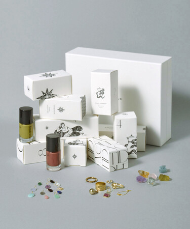クリスマスシーズンを彩る、スペシャルなボックスの中には、ジュエリーをはじめ、ネイルポリッシュ2色、お守りの原石2点、アソートのストーンチャーム1点、ジュエリーケアグッズ2種の合計10点がラインナップ。