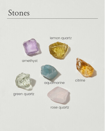 色とりどりに煌めく、お守りの原石は全6種の中から2種をご用意しました。それぞれの石の意味とともにお届けします。