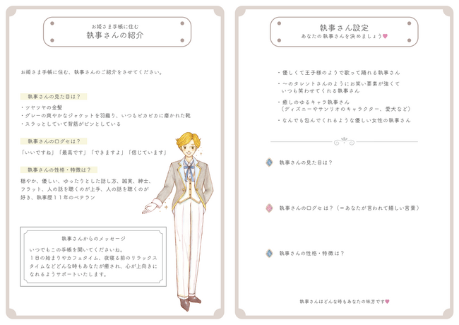 もっと自分に自信を持ちたい女性が、手帳に住む『執事』さんと一緒に、書くほど、自信をつけていくことができる手帳です。