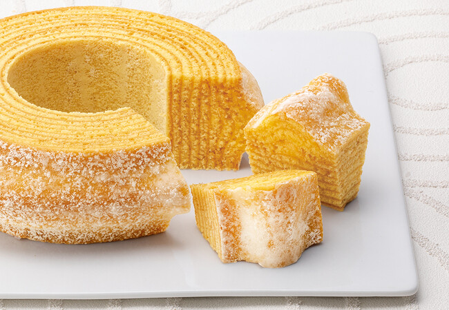 ねんりん家の誇る⼆大バームクーヘンのひとつ『ストレートバーム やわらか芽』。日本の味覚にふさわしい柔らかさを目指し、たっぷりの卵を贅沢に使ってふっくらとジューシーに焼きあげました。