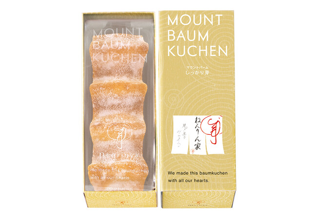 ねんりん家の代表作。⽪はカリッ、中はしっとり熟成の『マウントバーム しっかり芽』。濃厚なバター風味の生地を、独自の窯で長時間じっくり焼きあげておいしさを引き出した、こだわりのバームクーヘンです。