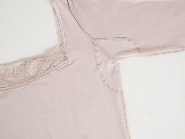 袖は長袖からはみ出ない8分丈、デコルテは首元から見えないスクエアネック、ウエスト周りはもたつかないスリップタイプに仕上げ、お洋服を美しく着こなせるよう細部までこだわりました。