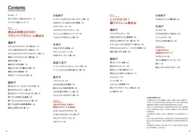 焼き煮、炒め煮、蒸し煮など、フライパンの特性を生かして手軽に作れる煮込みと、鍋を使って、かさのある野菜や厚みのある肉などをじっくり煮込むことでおいしさが増す煮込みを全59レシピ紹介しています。