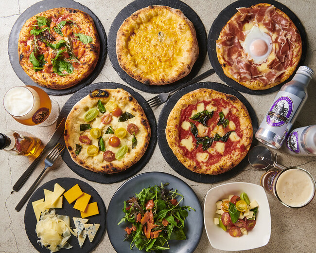 フードは注文を頂いてから1枚1枚生地をのばして石窯で焼き上げる本格ピザの他、15種を超える世界のチーズなどをご提供しています。