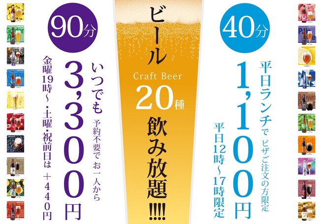 90分3,300円(税込)で20種のビールが飲み放題。 金曜19時以降・土曜終日・祝前日終日は+440円。