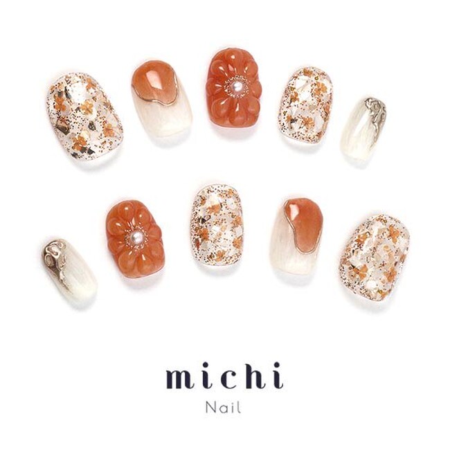 秋を存分に感じられる金木犀ネイル。立体感のあるお花のアートとハーバリウムのようなドライフラワーが美しいデザインです。秋っぽいシアーオレンジとクリアカラーで全体的に上品な色使い。秋のデートに使いたいオレンジネイルです。