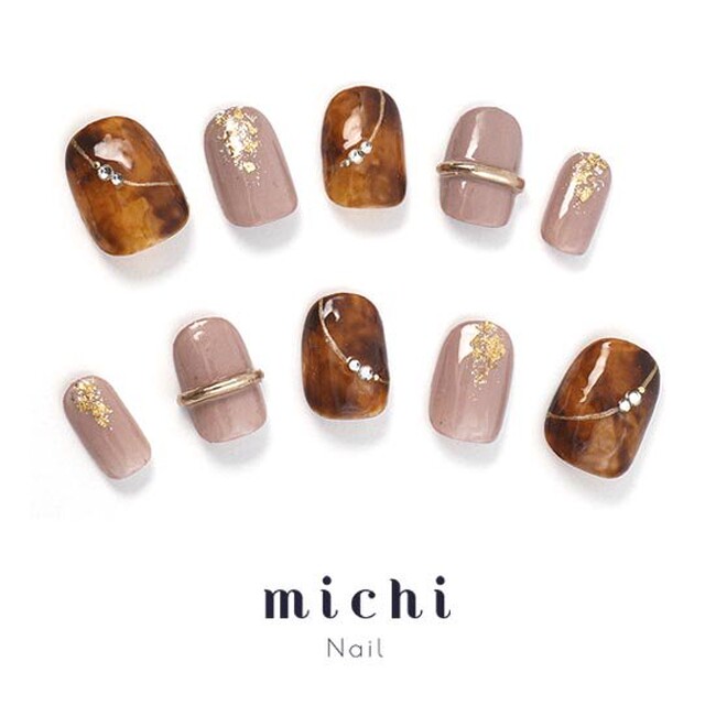 秋の定番べっ甲ネイル。リングのようなパーツでジュエリーをつけているかのようなゴージャスなデザインです。大人っぽいくすみピンクと金箔で上品に仕上がっています。いろいろなファッションと合わせやすいデザインで、秋ネイルに悩んでいる方にぜひおすすめしたいネイルチップです。