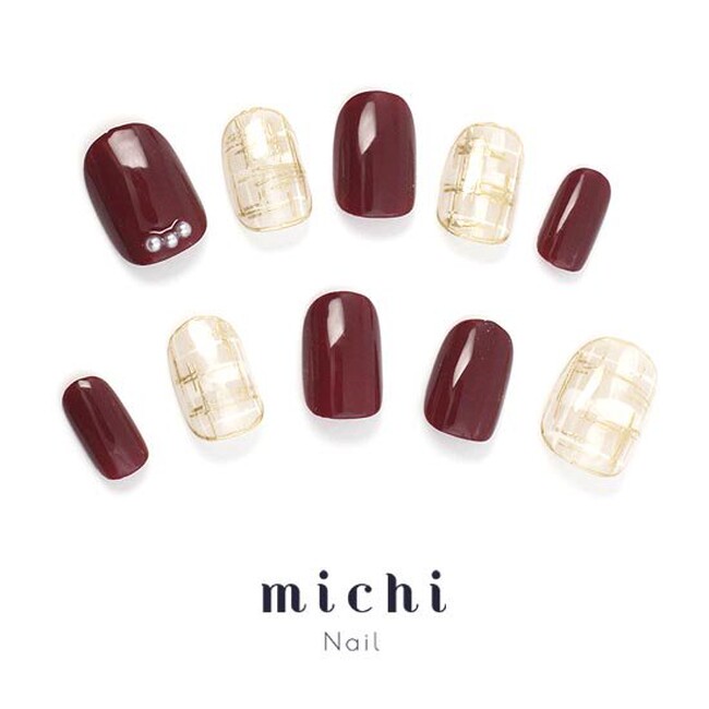 ボルドーが秋らしいシースルーチェックネイル。こっくりとしたボルドーカラーとシースルーチェックでバランスの取れたデザインです。パールのポイントで上品さもあり、カジュアルにもエレガントにもお使いいただけるネイルチップです。