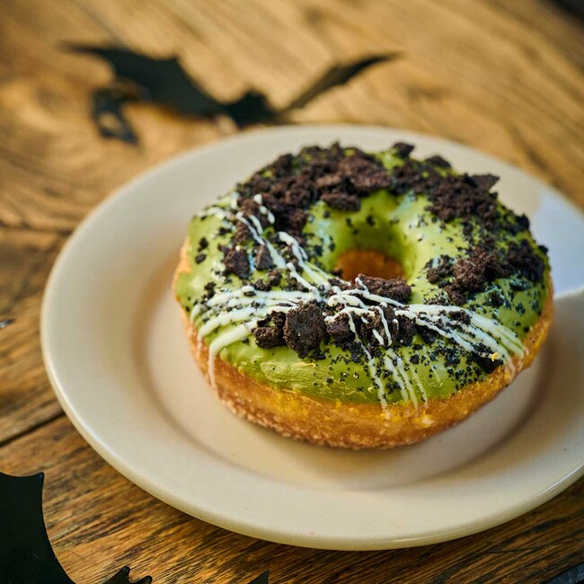 ハロウィン・ナイトをイメージしたドーナツ。抹茶チョコレートにホワイトチョコレートを加え、甘さのバランスを整えたグレーズにブラックカカオクッキーをトッピング。抹茶とクッキーの苦味とチョコの甘味が絶妙なバランスで、一度食べるとやみつきになる美味しさです。
