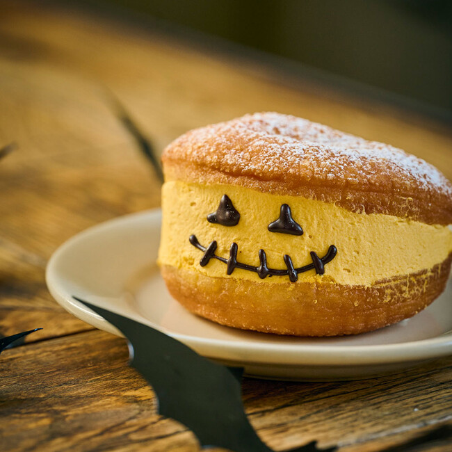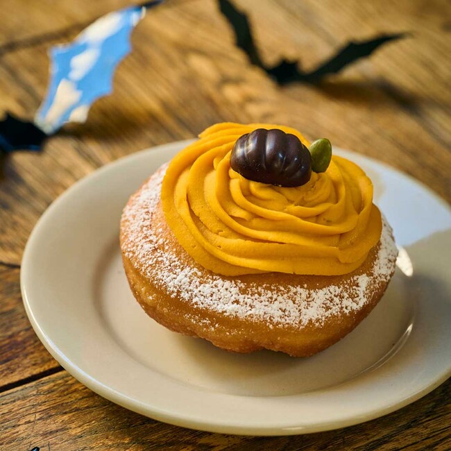 生クリームをたっぷり詰めたドーナツに、かぼちゃのクリームをモンブランケーキのように飾りつけた一品。手作りしたかぼちゃ型のビターチョコとカボチャの種をトッピングし、ハロウィンらしく仕上げました。甘さ控えめで舌触り滑らかな絶品クリームをご堪能ください。
