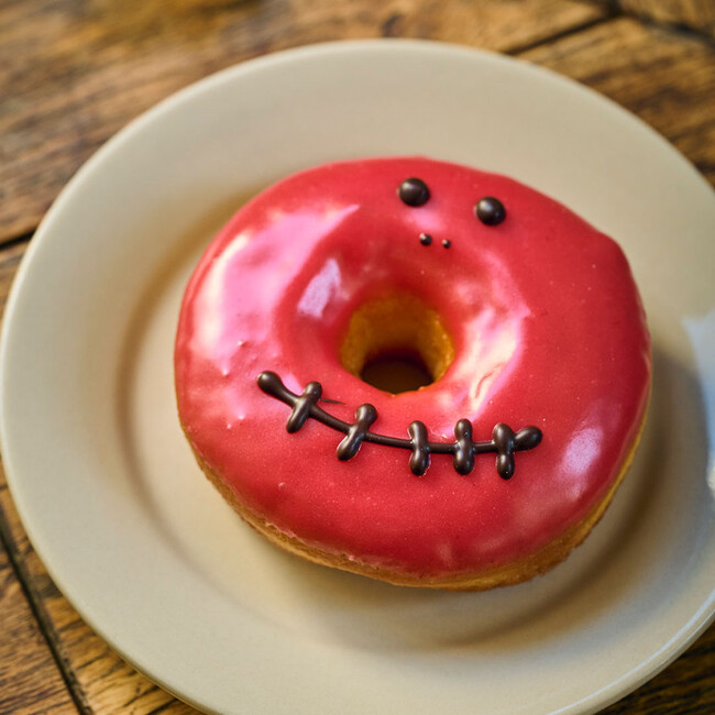 ゴーストをイメージしたフランボワーズドーナツ。定番商品の中でも人気のショコラフランボワーズをハロウィン仕様にチェンジ!フランボワーズピュレにレモンの果汁を合わせて作ったオリジナルグレーズは甘酸っぱい味わいがポイント。