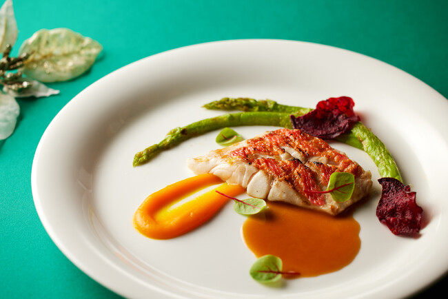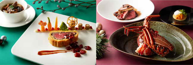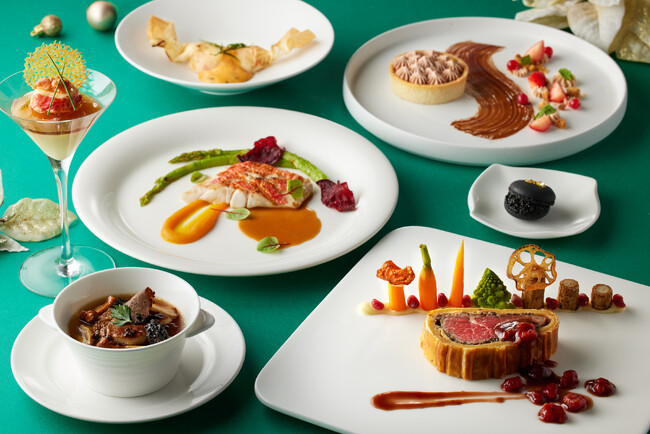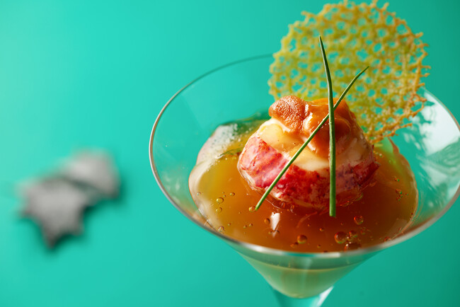 メインとなる「常陸牛フィレ肉のパイ包み フランボワーズ風味の赤ワインソース」は、上質な常陸牛フィレ肉と旨みたっぷりのデュクセルでパイに包み焼き上げ、濃厚で香り高い大人の赤ワインソースで仕上げました。添えられた甘酸っぱいフランボワーズが、味に変化をもたせるほか、華やかさを演出しています。カクテルグラスに盛られた見た目にも豪華な冷前菜「帆立貝とオマール海老のコンソメジュレ セロリラヴのムース ウニ飾り」は、帆立貝とスライスしたオマール海老、ウニがトッピングされた贅沢な一品です。