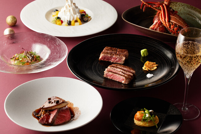 また、お客様が来店されてから捌く新鮮な伊勢海老を使った「活伊勢海老の鉄板焼き 5種のハーブ香るバターソース仕立て」など、夜景をバックにシェフが目の前で調理する、特別感のある鉄板焼ならではの演出と合わせてご堪能ください。その他、キャビアとウニを贅沢に使用した冷前菜から、黒トリュフと赤ワインを合わせた濃厚なソースが香り高い「フランス産フォアグラのソテーと神戸牛もも肉のコンフィ トリュフの香り」、デザートには、チョコレートアイスを包んだメレンゲを炎のフランベで演出する「ベイクドアラスカ」と、最初から最後まで至極の品が揃った、贅沢なディナーコースをお届けします。
