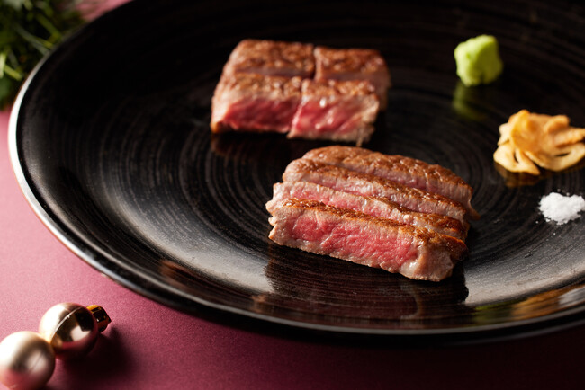 『鉄板焼 銀杏』のクリスマスディナーでは、メインに「くまもと黒毛和牛プレミアム「和王」フィレとサーロインのデュエット」をご用意しました。こだわり抜いた自慢のくまもと黒毛和牛プレミアム「和王」のサーロインとフィレを贅沢にも食べ比べでお楽しみいただけます。