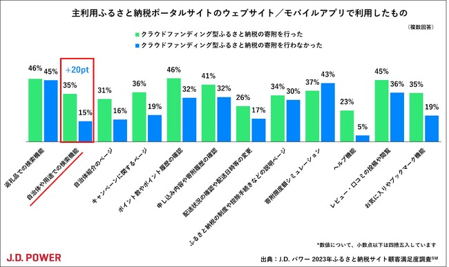 ふるさと納税サイトで利用した情報や機能については、「自治体や用途での検索機能」を選んだ人が、クラウドファンディング型寄附実施者では35%となり、非実施者(15%)と比べ+20ポイントとなりました。