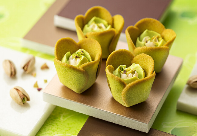 香ばしく芳醇な香りがお口いっぱいに広がる『チューリップローズ ピスタチオ』。「グリーン・チューリップラングドシャクッキー」の中には、「ピスタチオ&ミルクのショコラクリームローズ」を咲かせました。ナッティなピスタチオの魅力を、クリーミーなミルクのコクとともに味わう“ピスタチオの花園”です。