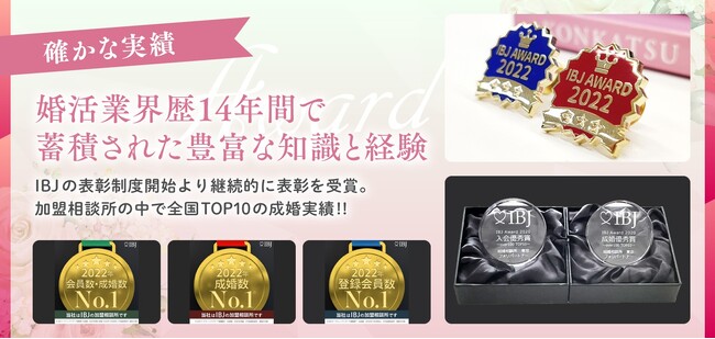 専任カウンセラーが担当できる会員様を少人数に絞り、その分手厚いサポートをすることにより、高い成婚率を着実に出している結婚相談所で、2019年度より開始された「IBJ(日本結婚相談所連盟)」の表彰制度で開始当初より継続的に表彰を受けており、ご入会者伸び数とご成婚者伸び数にて全国TOP10、直近では2023年10月に開催された「IBJサミット」の特別表彰式にて、全国約4,050社の加盟結婚相談所中、「成婚数全国TOP7」「成婚率全国TOP7」に選ばれ、「成婚数」「成婚率」の2部門で表彰を受けたのは全国で3社のみでした。