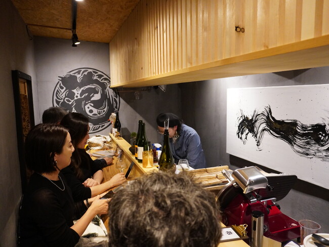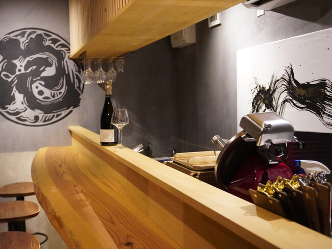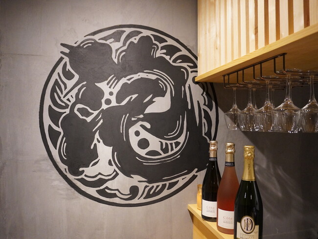 内装の壁面の塗装やカウンター作り、提灯や壁面ロゴのデザインと描画、お店のシンボルとなるカウンター正面の絵画まで堀口のこだわりを心身ともに詰め込んだ。