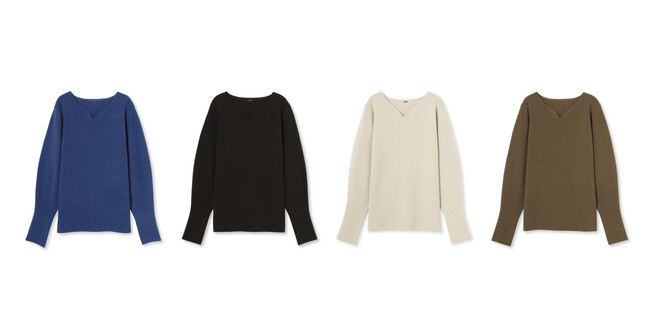 全て自宅で洗濯可能なニット素材となっており、旬なハーフジップデザインのスキッパーニット、鮮やかなカラーを取り揃えた畔編みニット、蓄熱機能素材を使用したデコルテ開きニットとタイプの異なる3デザインがラインアップ。