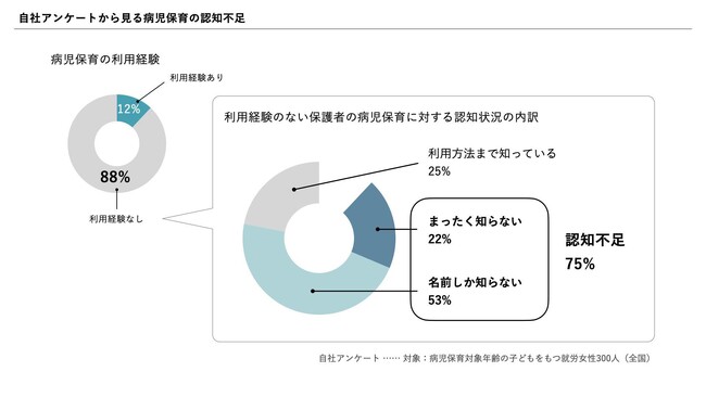 弊社が全国の子どもを持つ就労女性300人にアンケートを行ったところ、「病児保育の利用経験がない」と答えた方は88%にのぼりました。さらに病児保育を利用したことがない方に、病児保育について知っているか聞くと、75%が「知らない」もしくは「名前しか知らない」と回答しました。また、アンケート結果から、手続きの煩雑さが利用を遠ざけているということも分かりました。