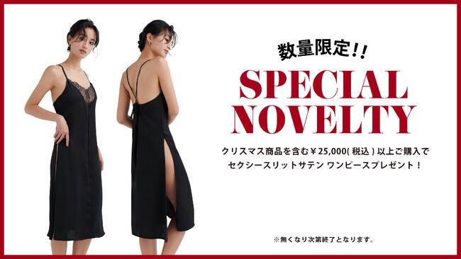 公式オンラインストア/全国店舗にて、クリスマス商品を含む¥25,000(税込)以上ご購入の方に「セクシースリットサテンワンピース」をプレゼント。詳細はキャンペーン特設ページよりご覧いただけます。