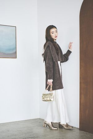 スヌードとショールカーディガンの新鮮なレイヤードスタイルが楽しめるニット。長さのあるショールカーディガンは縦長のIラインを作れるようにインナーとスカートを同色でまとめたのがポイントです。ふんわりとした素材のニットに光沢のあるサテンスカートの相性が冬ならではの組み合わせに。ブラウンのニットのウォーム感をゴールドの小物が盛り上げてくれます。
