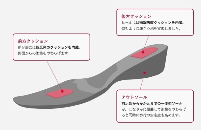 2. fitfitオリジナルの「3in1ソール」を採用。衝撃吸収の良いEVA素材を内蔵したミッドソールと、軽量ラバーのアウトソールの組み合わせで快適歩行を促します。
