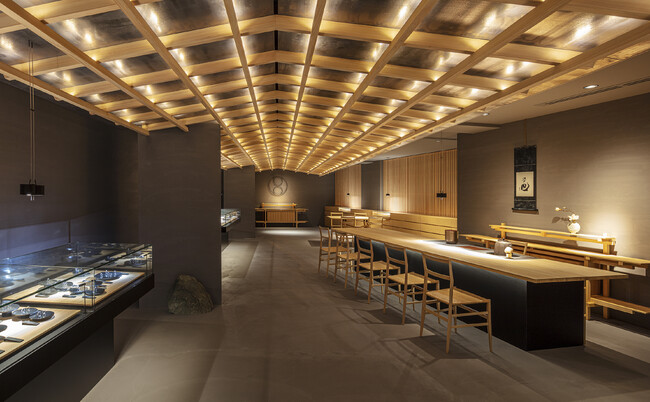 店内は由緒ある寺社仏閣で馴染み深い枯山水や、京都の街中の風景の一つでもある町屋風情を映し出す犬矢来をモチーフとして取り込み、伝統と洗練が織りなす、粋で上品な空間を造り出しました。