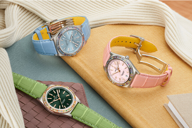 新作はアイスブルー、グリーンのメタリックダイヤルと、ピンクのマザーオブパールのダイヤルの展開。いずれもダイヤモンドをセットしたインデックス、多彩な宝石をあしらったベゼルが特徴。ダイヤルと色を合わせたアリゲーターレザーストラップ、またはブライトリング独自のルーローブレスレットからお選びいただけます。