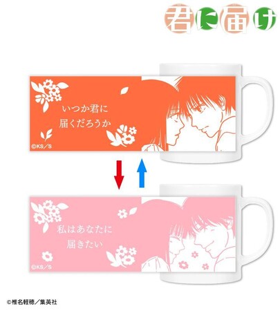 温度に反応する特殊なインクを使用しており、マグカップに温かい飲み物を入れると黒沼爽子と風早翔太のイラストが1巻から最終巻に変化します。