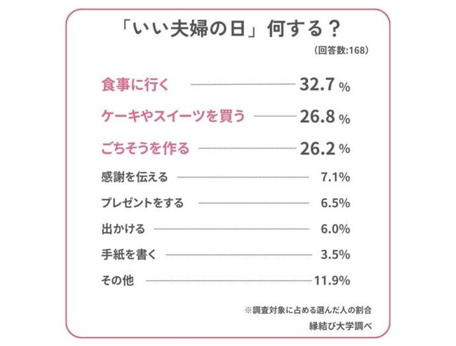「いい夫婦の日」に何かをする予定がある人に何をするか尋ねてみると、32.7%の人が「食事に行く」で1位。次いで「ケーキやスイーツを買う」26.8%、「ごちそうを作る」26.2%という結果になりました。