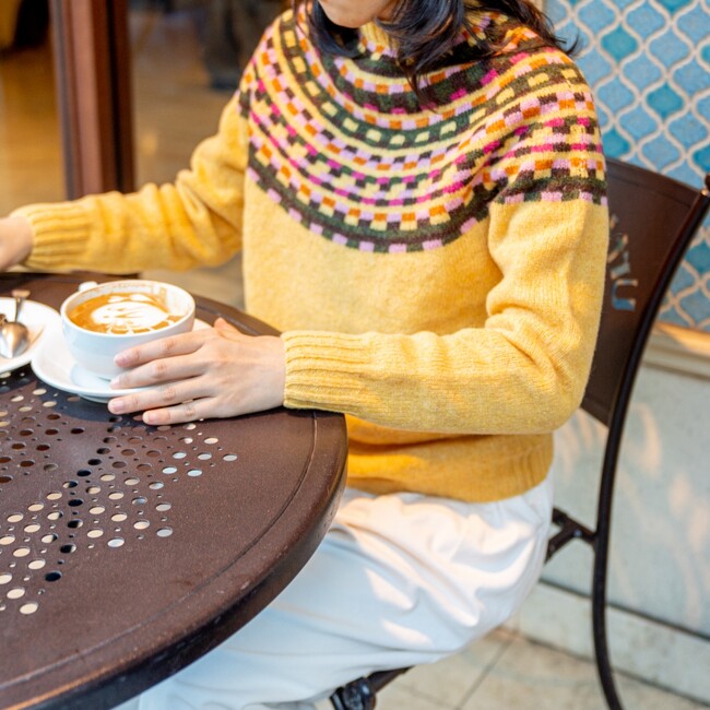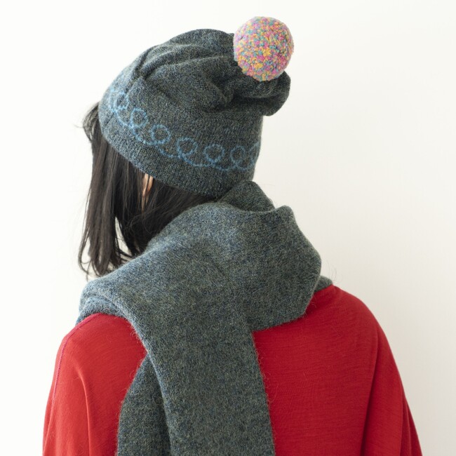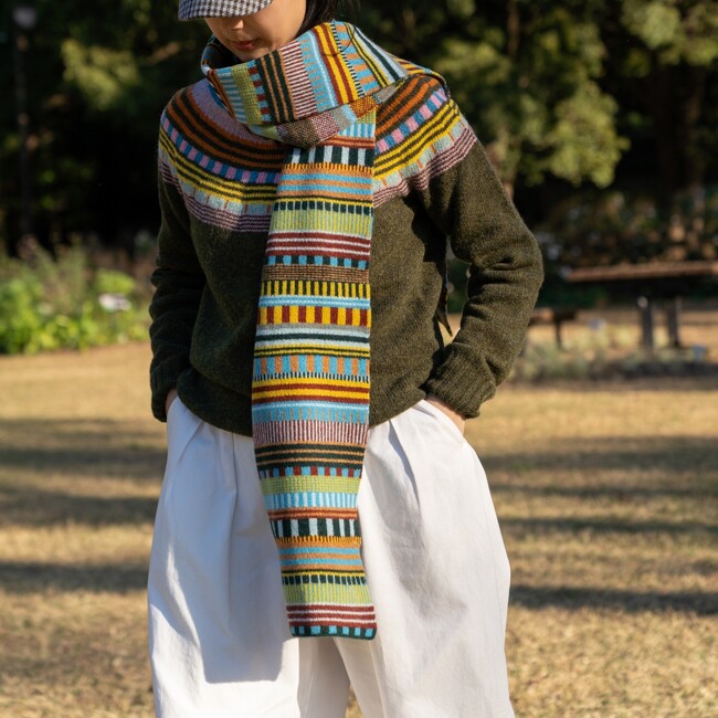 スコットランドで編まれたラムウール100%のアイテムは素材にこだわって作られています。インパクトと上品さが共存するドナのアイテムは、コーディネートが暗くなりがちな冬に華やさをプラスしてくれます。